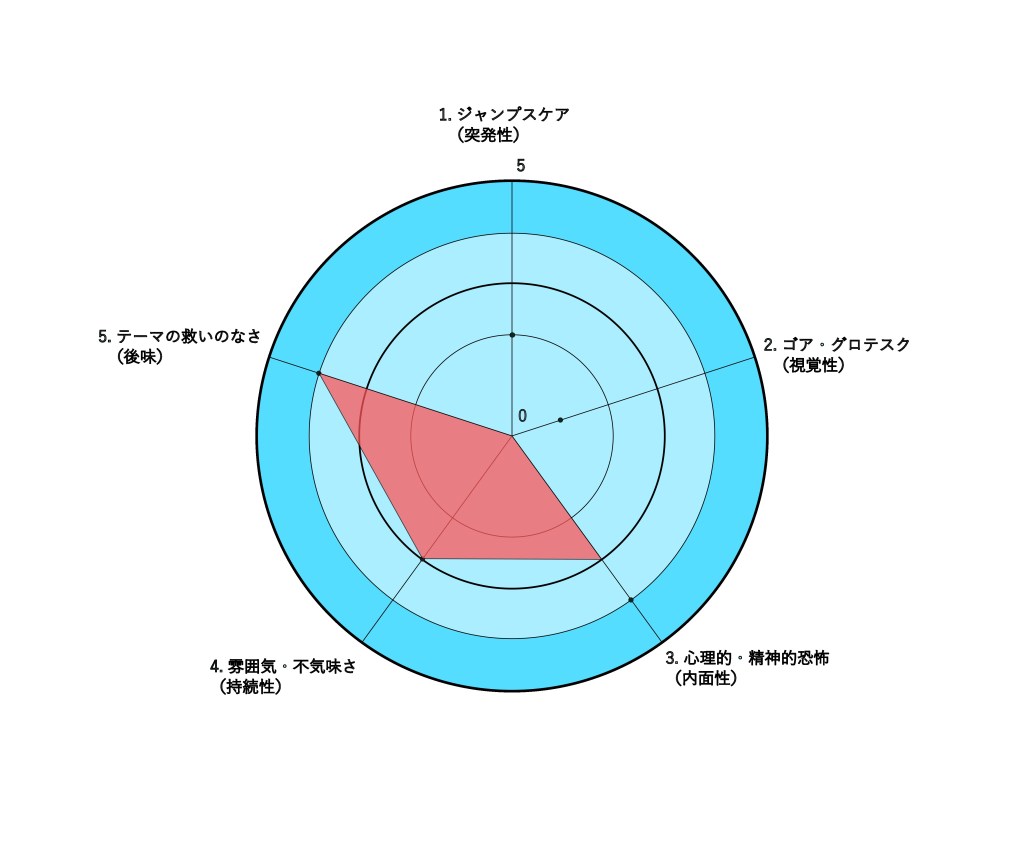 本作はグロやジャンプスケアが「0 / 5」であり、ホラーが苦手な方でも安心して鑑賞できる知的考察対象です。しかし、ディストピア・絶望度は4 / 5と非常に高く、鑑賞後の精神的疲労は中程度です。