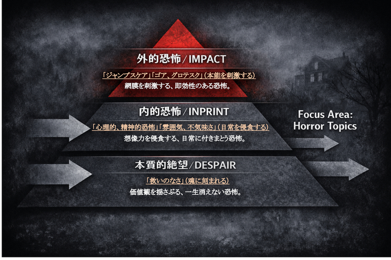 「ジャンプスケア」などの最上段の「怖さ」は上映の段階で消えてしまいますが、その要素が下段に移るにつれ見る側の中に残るタイミングは長くなり、最下段では“人生のどこかでふと蘇る”可能性すらあります。